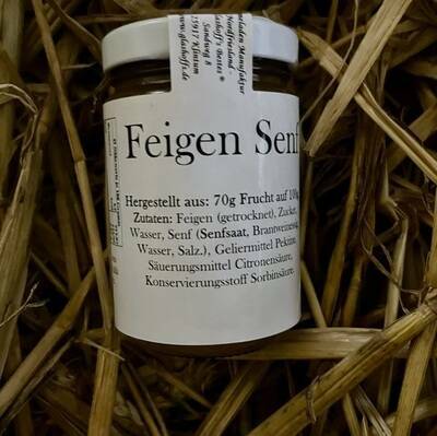 Feigen (getrocknet) , Zucker, Wasser, Senf, ( Senfsaat, Brantweinessig, Wasser, Senf.) Geliermittel Pekine, Säuerungsmittel Citronensäure, Konservierungsstoff Sorbinsäure