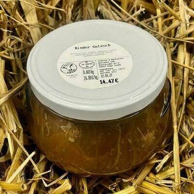 95 % Rindfleisch, Zwiebeln, Speisesalz, Pfeffer, Soßenbinder, (Stärke, Milchreis, Gewürze, Farbstoff, Zuckerkulör)